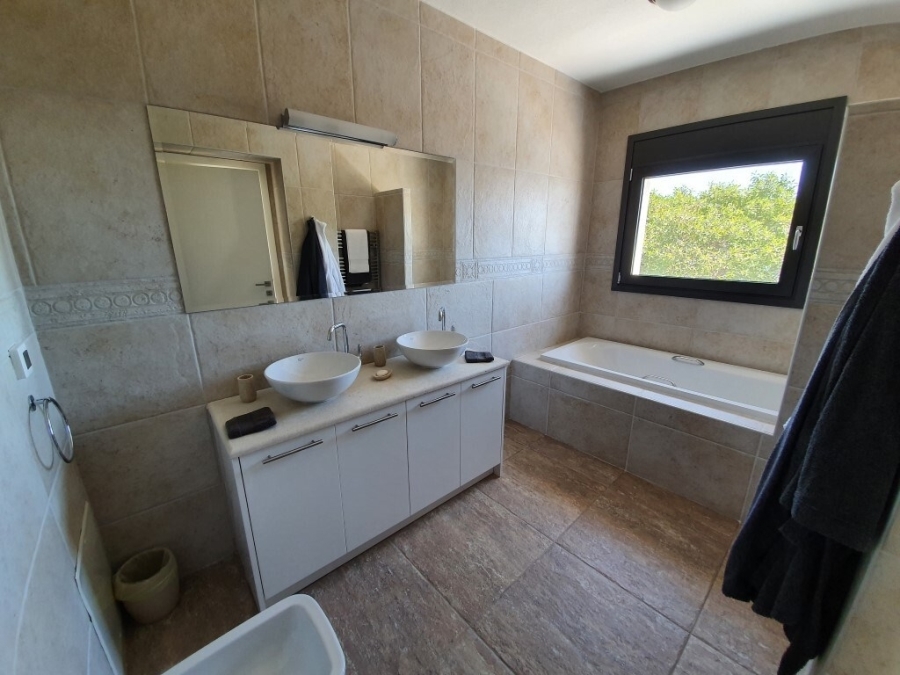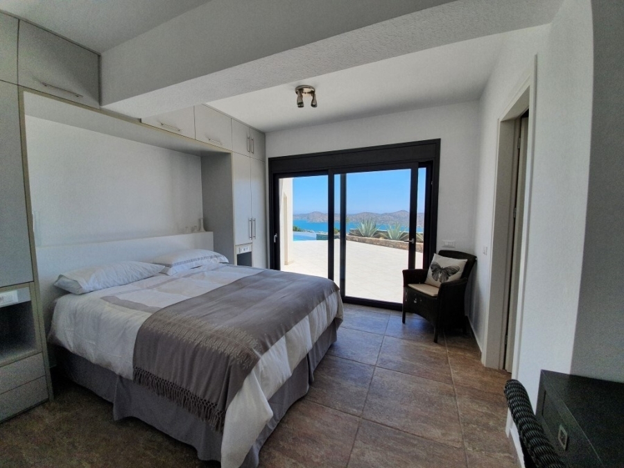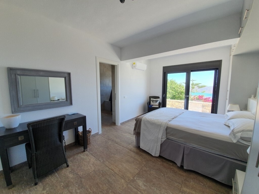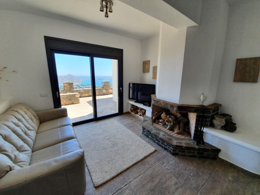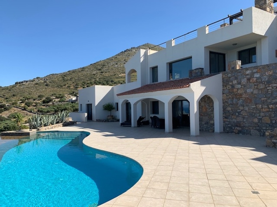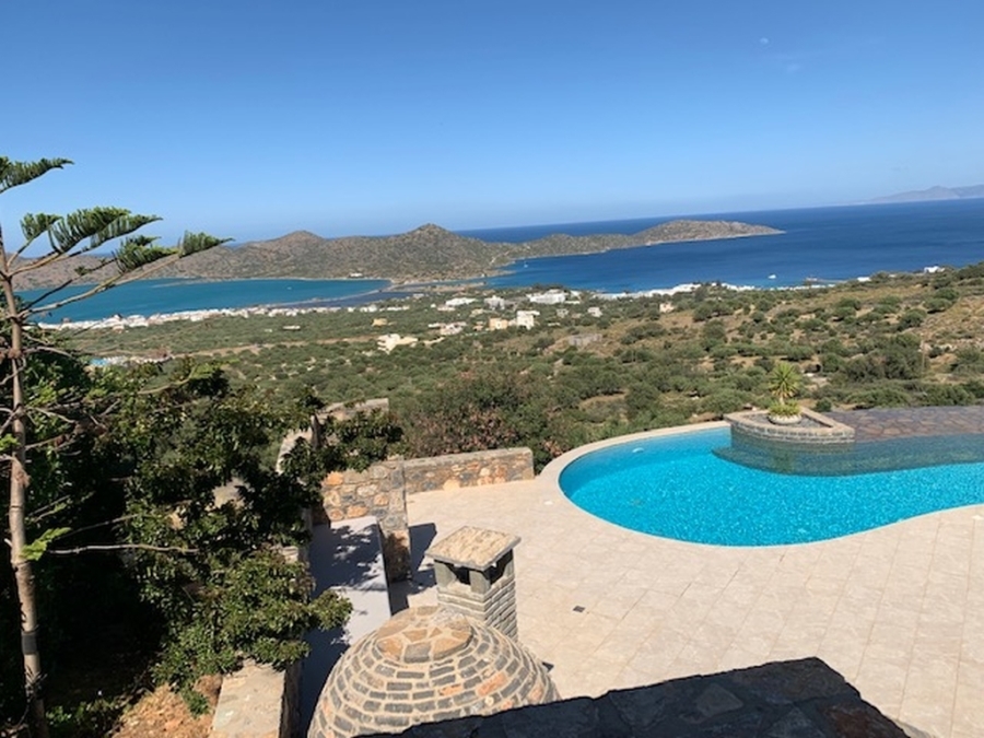 Furnished luxury villa of 300m2 is available for sale at a distance of just 1.5km from the sea, 1km from Elounda and 75km from the International Airport of Heraklion. Designed in simple lines where the white color dominates, it develops in three levels. The ground floor opens into a hall that leads to a fully equipped kitchen with a spacious dining room whose windows open to the comfortable terrace with stone outdoor seating. On the same level next to the kitchen there is a large laundry and storage room. Going forward, we meet a living room with fireplace and one bedroom that has an internal bathroom with bathtub. The lower level has a comfortable living room with fireplace and bar, a WC, a storage room, a desk and two bedrooms where each has its own bathroom with bathtub. Stairs lead to the first floor where we find the main bedroom with private bathroom with large oval bathtub and its own huge terrace offering a wonderful view of the bay of Elounda. The villa provides alarm, solar system, two fireplaces and air conditioning. The use of natural stone in combination with modern simple lines add warmth and character to this wonderful villa that grows within 10.000m2. Outside it is surrounded by a lush garden with trees and various plants. Completed with pool 76m2 wood oven – BBQ, outdoor dining area and private parking for 4 vehicles. The calm waters of Elounda and the sounds of nature compose a dreamy setting around this enchanting villa.